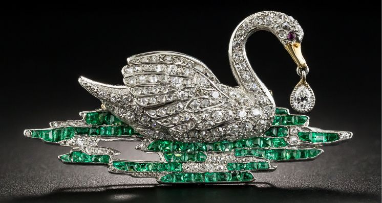 Cover image: The front of a beautiful swan pin, showing the calibré cut emeralds and the typical swinging diamonds, all set in platinum. All images courtesy of Cole Bybee and Lang Antiques.