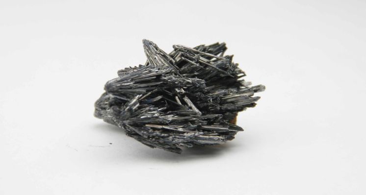 It is lead-grey with a blue tint and can show some iridescence. Opaque, it has a metallic lustre, i.e. reflects light perfectly like a mirror. With a hardness of only 2 on the Mohs scale and one perfect cleavage direction, it is extremely soft and brittle. As a result, stibnite is rarely fashioned or used in jewellery.