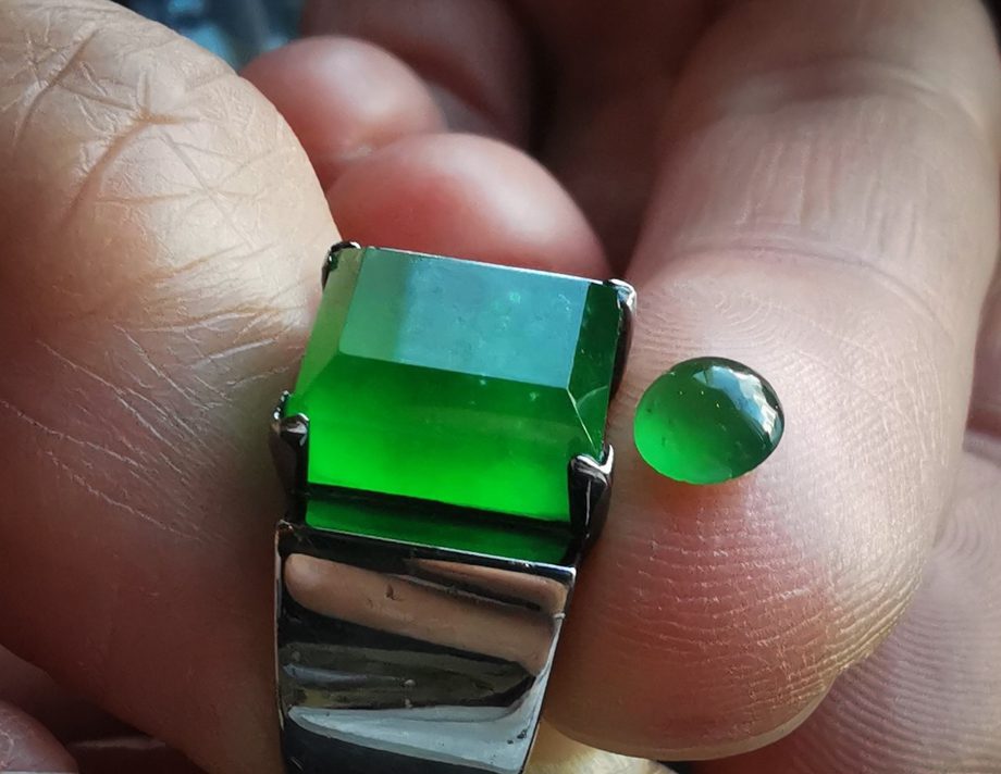 Main Image: A ring containing top-quality ‘Imperial green’ jade from Myanmar (courtesy of Stanley Chu) is shown together with a 0.54 ct cabochon of fine Guatemalan jade analysed in this study. Photo by S. I Liu.